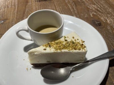 レモンピールとピスタチオのケーキ。正確な名前は忘れました。カップの中はピスタチオのソース。