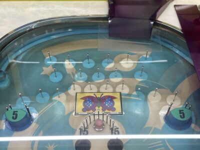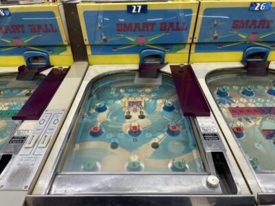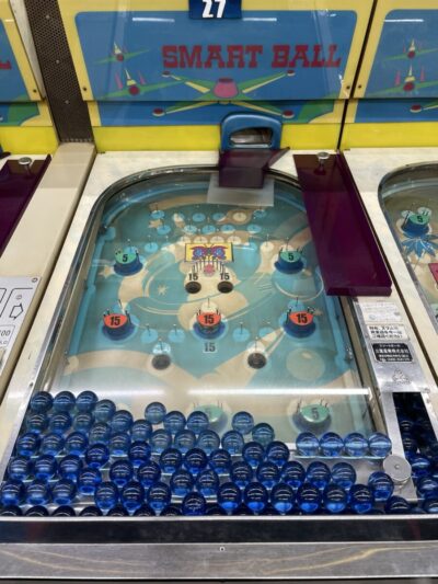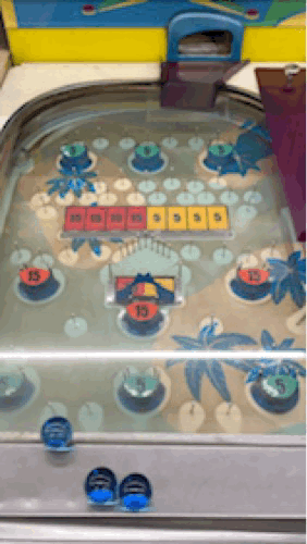 レバーを引いてガラス玉を転がし、台の穴に入れるとご褒美のガラス玉が出てくる遊び。パチンコやメダルゲームみたいなものだ。